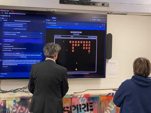 Prof. Dan Brown and a TGI student demoing 'Burgertroids' - a game built during the Student Summit event using Replit