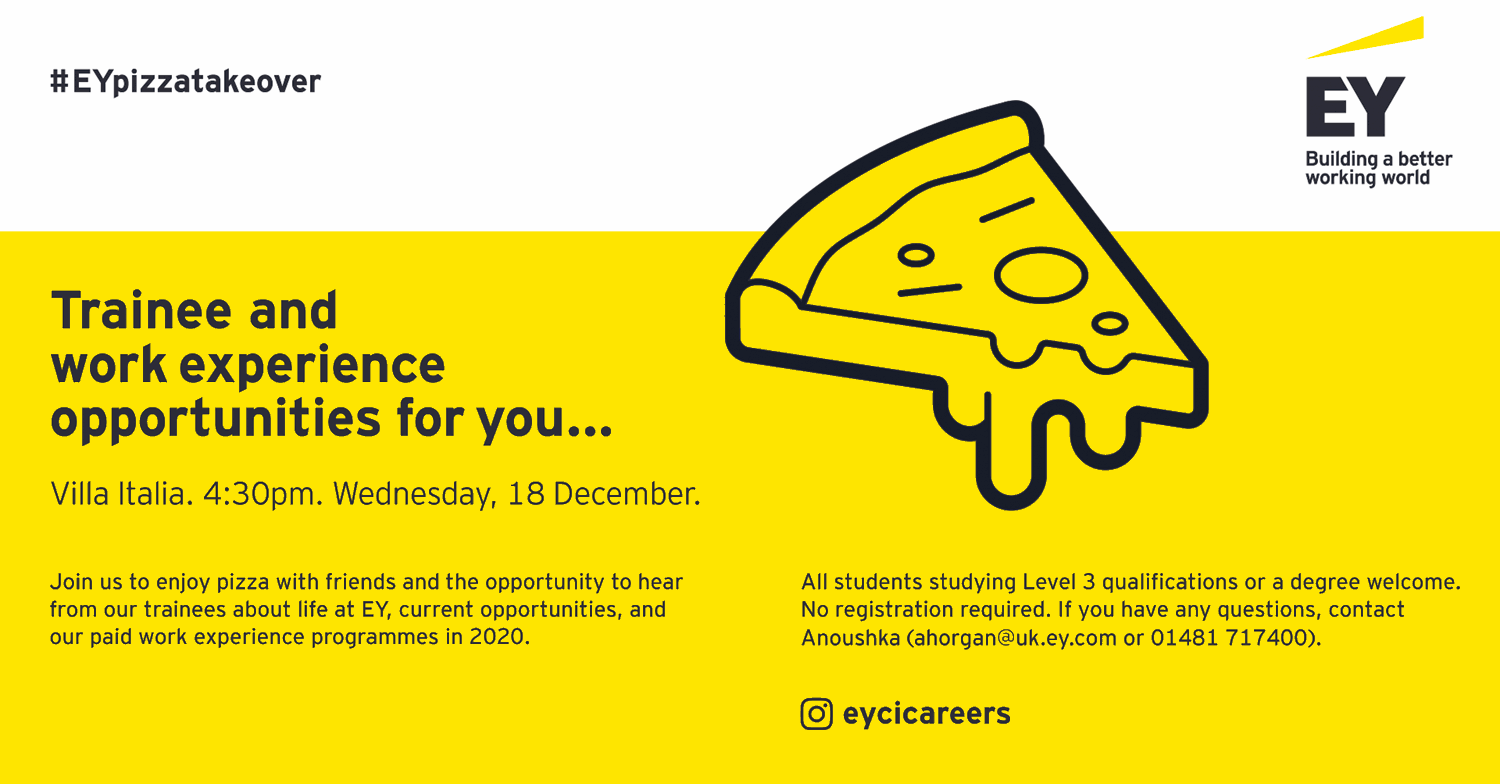 EY Channel Islands will be hosting an event for students studying level 3 qualifications and degrees, join us for a #PizzaTakeover at Villa Italia on Wednesday 18th December from 16:30 - 18:00. EY will be looking to recruit people into their ITRA team in 2020 to join amongst others, Digital Greenhouse Discover Digital Intern, Alex Turner.