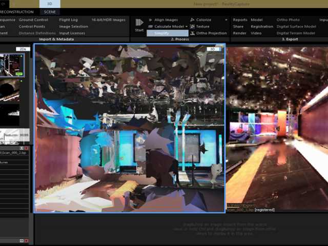 Technology uses the real world and turns it into data points. These data points are used to create geometric shapes which can then be translated into recognisable images. Pictured below is how the Maya software turns its data into a reality capture output. From here, Chris uses a combination of different images to make sense of and map out what is happening within the set.
